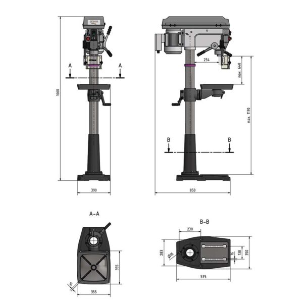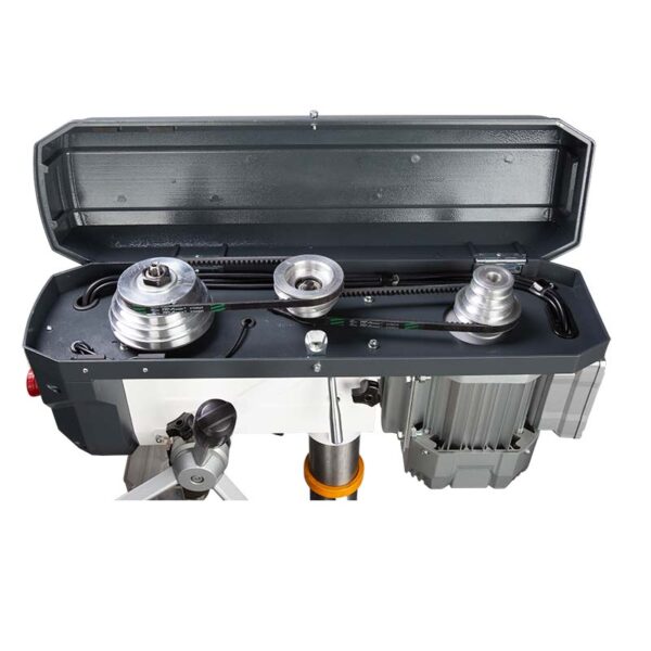 Βαρέως τύπου. Ιδιαίτερα αθόρυβη λειτουργία χάρη στη νέα σχεδίαση ατράκτου. Βιομηχανικός κινητήρας. Ξεχωριστό μπουτόν διακοπής έκτακτης ανάγκης. Διακοπή βάθους διάτρησης.Ενδεικτική λυχνία LED ενσωματωμένη στο κεφάλι του τρυπανιού. Σταθερό τραπέζι με διαγώνια T-slots με κανάλι ψύξης νερού. Τραπέζι διάτρησης κεκλιμένο ± 45 ° και περιστρεφόμενο 360 °. Κάλυμμα ιμάντα V με διακόπτη ασφαλείας. Διάτρηση άξονα ακριβείας. Λειτουργία μηχανής με ηλεκτρικά ασφαλείας σε τάση 24 V DC. Χαλύβδινος άξονας με χοντρό τοίχωμα για καλύτερη σταθερότητα. Μεγάλης διάστασης πλάκα βάσης με υποδοχές T.