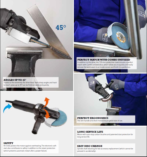 - Συμπαγής σχεδιασμός για γρήγορη αφαίρεση της σκωρίας συγκόλλησης, σκουριά ή το χρώμα από στενούς χώρους, π.χ. κατασκευές πλαισίου