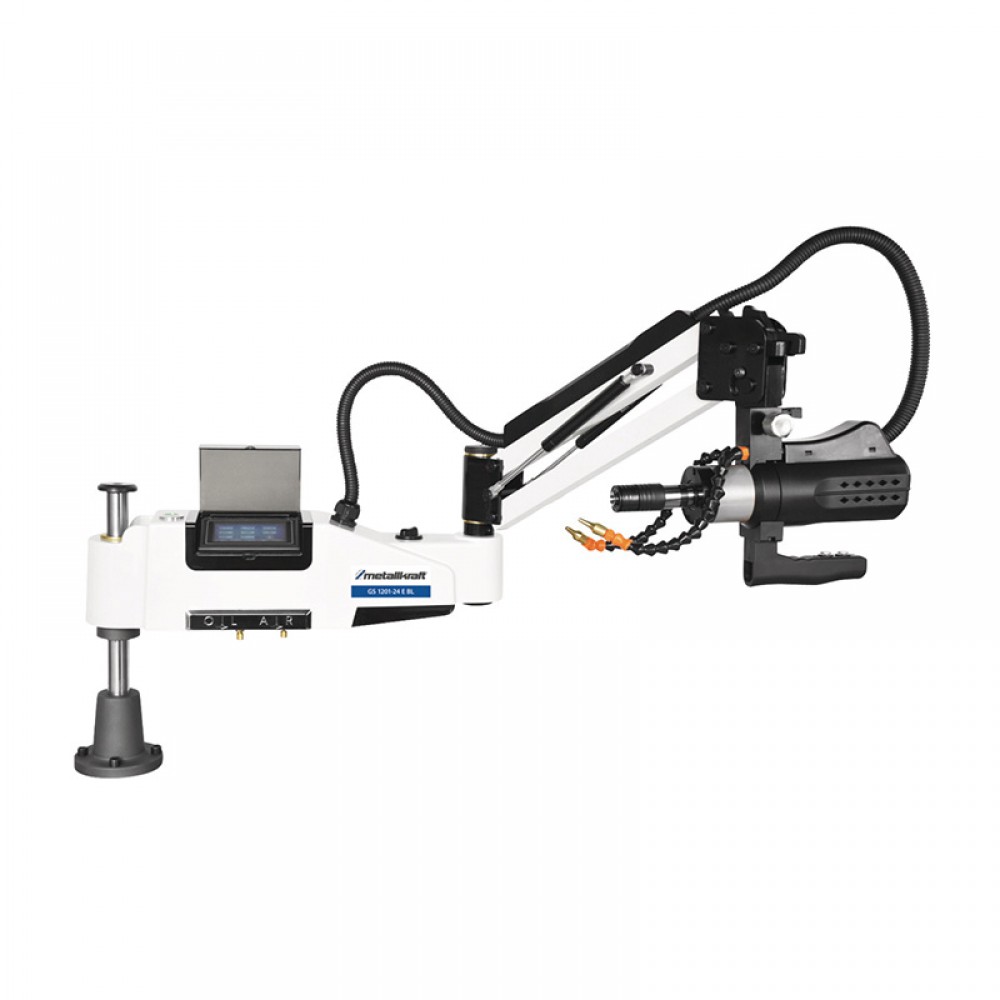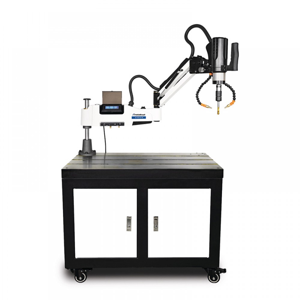 Προγραμματιζόμενη λειτουργία ψύξης με αέρα και λίπανσης (απαιτείται εξωτερική πηγή πεπιεσμένου αέρα με πίεση λειτουργίας 6-8 bar και). Η κεφαλή του δραπάνου μπορεί να περιστραφεί από 0 έως 90 μοίρες. Τσοκ ταχείας αλλαγής με ολισθητικό συμπλέκτη για ασφαλή κοπή σπείρωματος χωρίς κίνδυνο θραύσης. Περιστροφή δεξιά/αριστερά στο σώμα του δραπάνου. Ρύθμιση μεγέθους, ταχύτητας, βήματος και βάθους κοπής μέσω οθόνης αφής στον περιστρεφόμενο βραχίονα. Χειροκίνητη λειτουργία: Αφού φτάσετε στο καθορισμένο βάθος κοπής, ο άξονας σταματά αυτόματα, προς τα εμπρός και για να στραφεί αριστερόστροφα πρέπει να ενεργοποιηθεί χειροκίνητα. Αυτόματη λειτουργία: Μόλις επιτευχθεί το καθορισμένο βάθος κοπής, το μηχάνημα αλλάζει αυτόματα από δεξιόστροφα σε αριστερόστροφα. Ιδανικό για το άνοιγμα σπειρωμάτων σε πολλές τυφλές οπές.