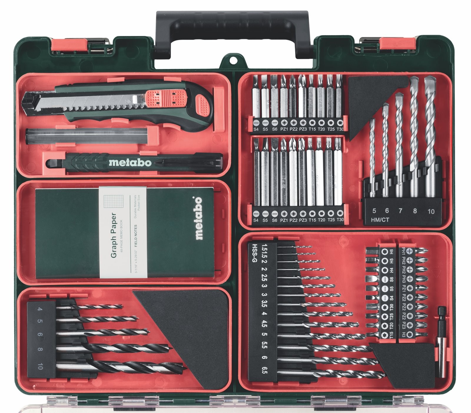 - Κινητό συνεργείο: πλαστική θήκη μεταφοράς με μια μεγάλη γκάμα αξεσουάρ για διάτρηση, βίδωμα και περισσότερα