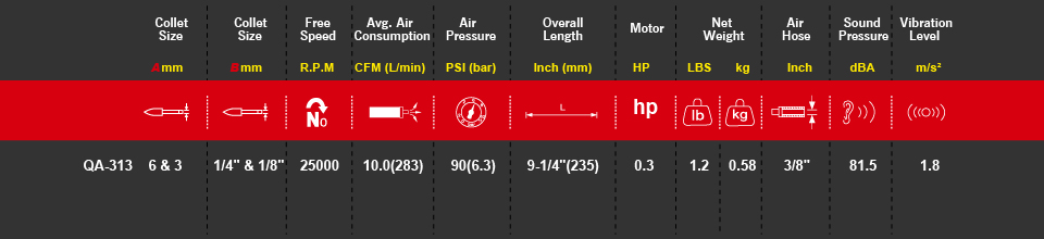 O αεροτροχός QA-313 έχει εργονομικό σχεδιασμό για μέγιστη ευελιξία. Έχει ιδιαίτερα ακριβής ρύθμιση στροφών για καλύτερο έλεγχο του εργαλείου.