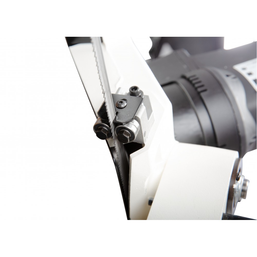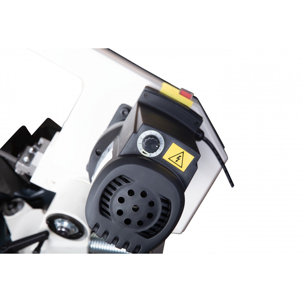 Το πριόνι διαθέτει υψηλής ποιότητας διμεταλλική πριονοκορδέλα ως στάνταρ και ρυθμιζόμενο στοπ υλικού για τυπική εργασία. Η κίνηση της λάμας ενεργοποιείται και απενεργοποιείται μέσω του κουμπιού στον μοχλό. Η πλάκα βάσης διαθέτει αντιολισθητικές βάσεις, ενώ οι χαμηλοί κραδασμοί και η χαμηλή φθορά διασφαλίζονται από το ειδικό κιβώτιο ταχυτήτων με δύο γρανάζια από σκληρυμένο χάλυβα. Ο κινητήρας Vario με χαμηλή ταχύτητα και ψήκτρες άνθρακα εξασφαλίζει έως και 10 φορές μεγαλύτερη διάρκεια ζωής, ενώ ο βραχίονας του πριονιού ρυθμίζεται σε κλίση από 0° έως +60° για γωνιακές κοπές.