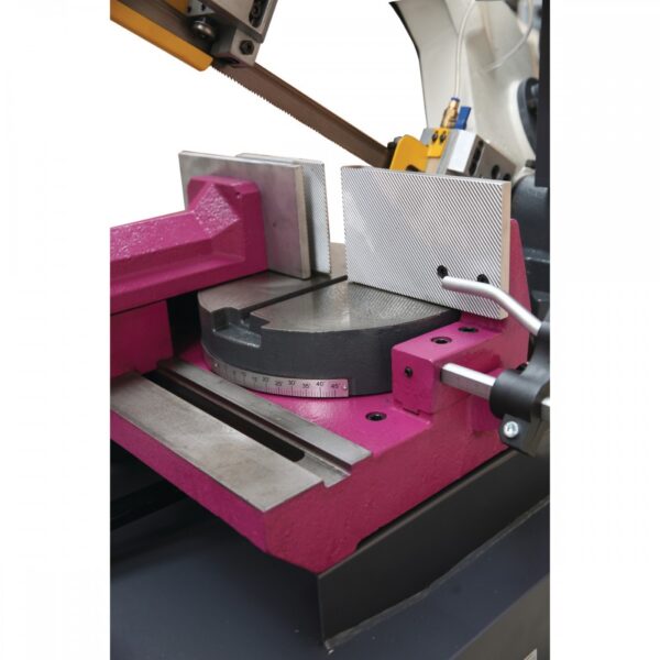 Το πριόνι διαθέτει υψηλής ποιότητας διμεταλλική πριονοκορδέλα ως στάνταρ και ρυθμιζόμενο στοπ υλικού για τυπική εργασία. Η κίνηση της λάμας ενεργοποιείται και απενεργοποιείται μέσω του κουμπιού στον μοχλό. Η πλάκα βάσης διαθέτει αντιολισθητικες βασεις, ενώ οι χαμηλοί κραδασμοί και η χαμηλή φθορά διασφαλίζονται από το ειδικό κιβώτιο ταχυτήτων με δύο γρανάζια από σκληρυμένο χάλυβα. Ο κινητήρας Vario με χαμηλή ταχύτητα και ψήκτρες άνθρακα εξασφαλίζει έως και 10 φορές μεγαλύτερη διάρκεια ζωής, ενώ ο βραχίονας του πριονιού ρυθμίζεται σε κλίση από 0° έως +60° για γωνιακές κοπές.